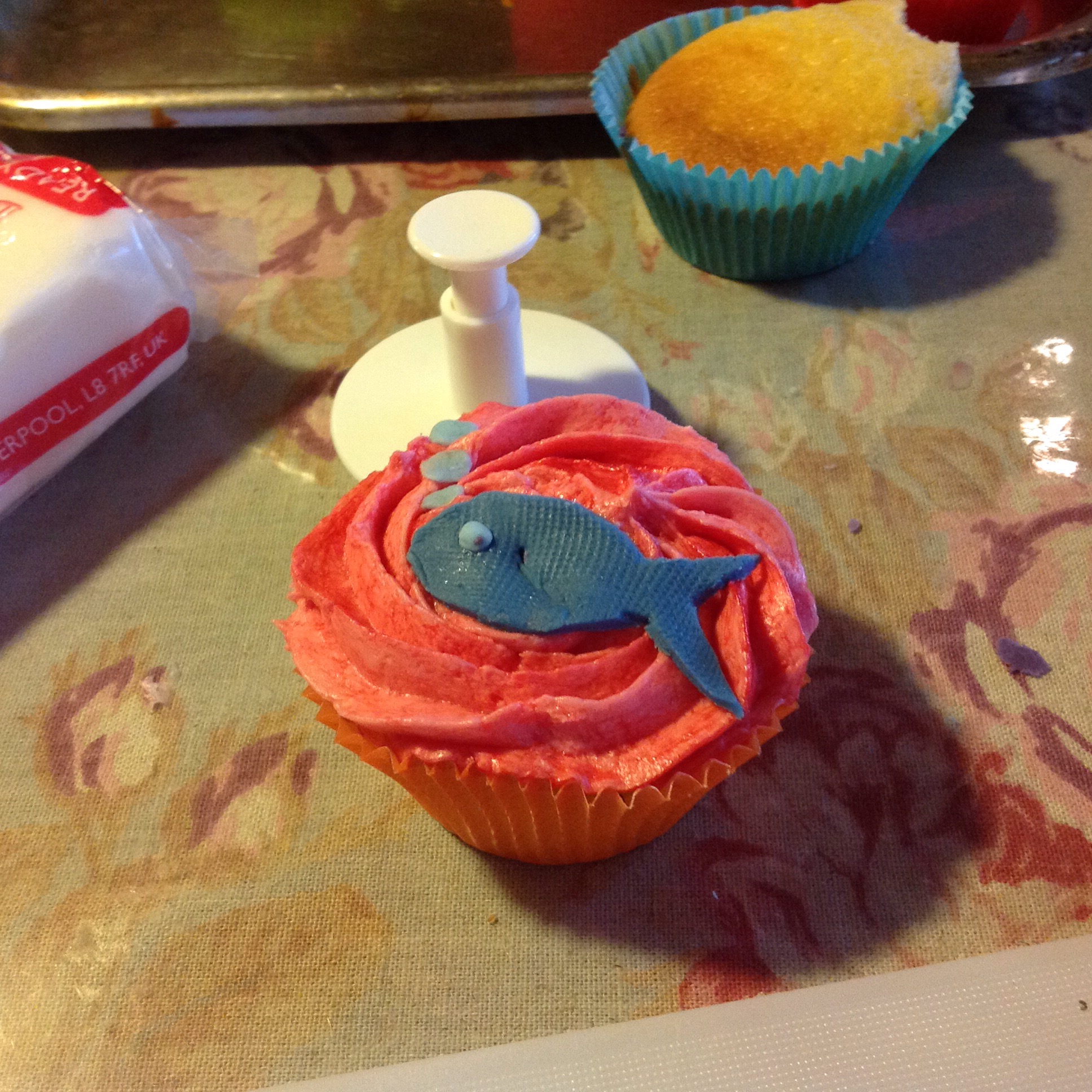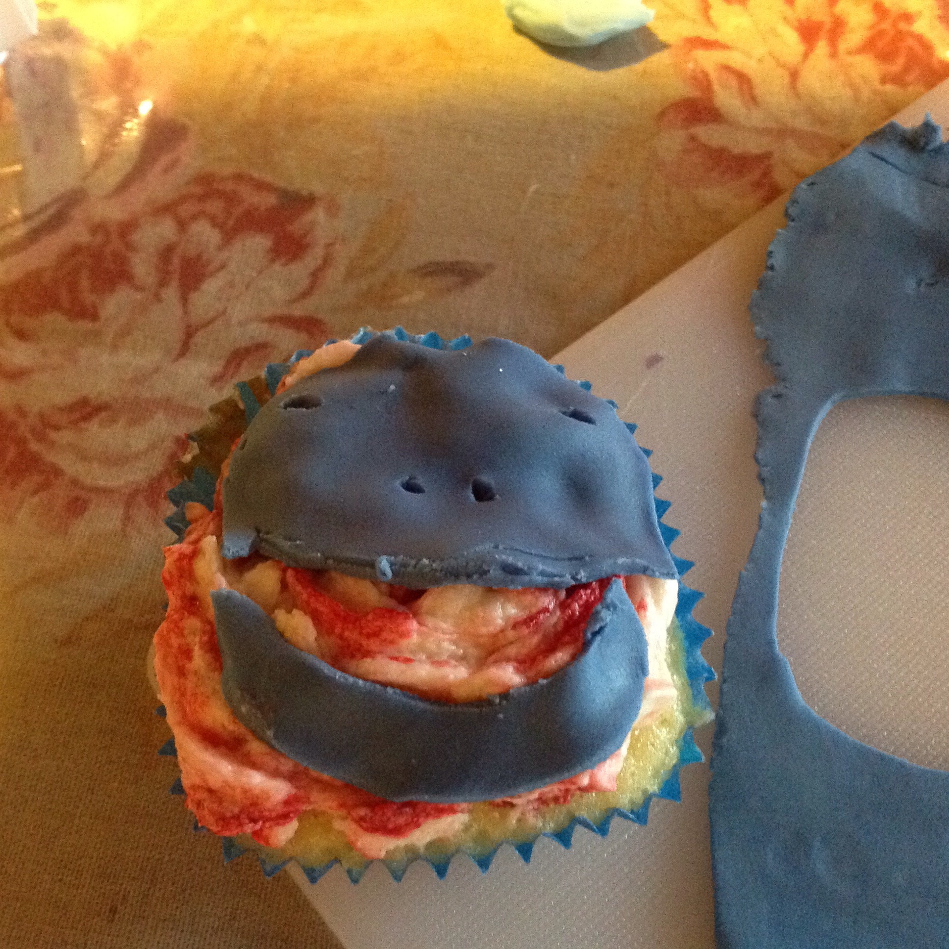 Now on to cupcake making… the boys were all gone doing shopping or bug hunting (they found a really big bug that likes to play dead). So as it was a rainy and wet day we got the cupcake decorating stuff out I made the creepiest face out of fondant it was scary and weird at the same time!
